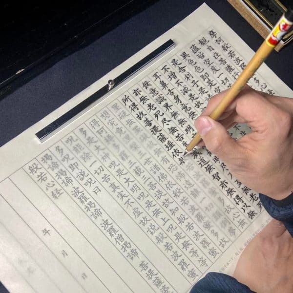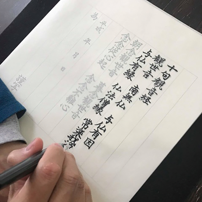 Copying the sutras (the sermons of Buddhism) written in kanji characters for blessing.