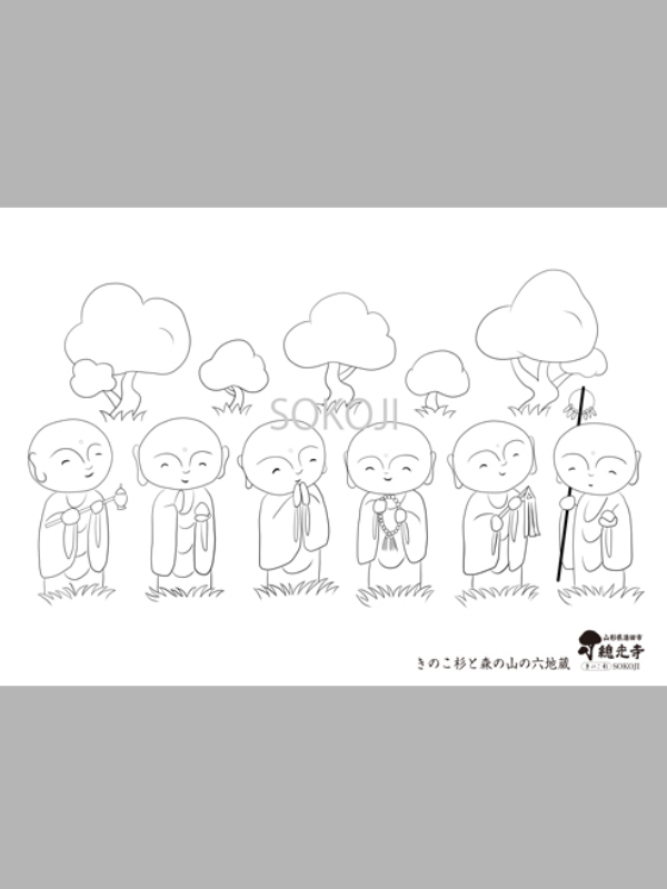 總光寺のシンボルきのこ杉と森の山の六地蔵さまのかわいい写仏です。